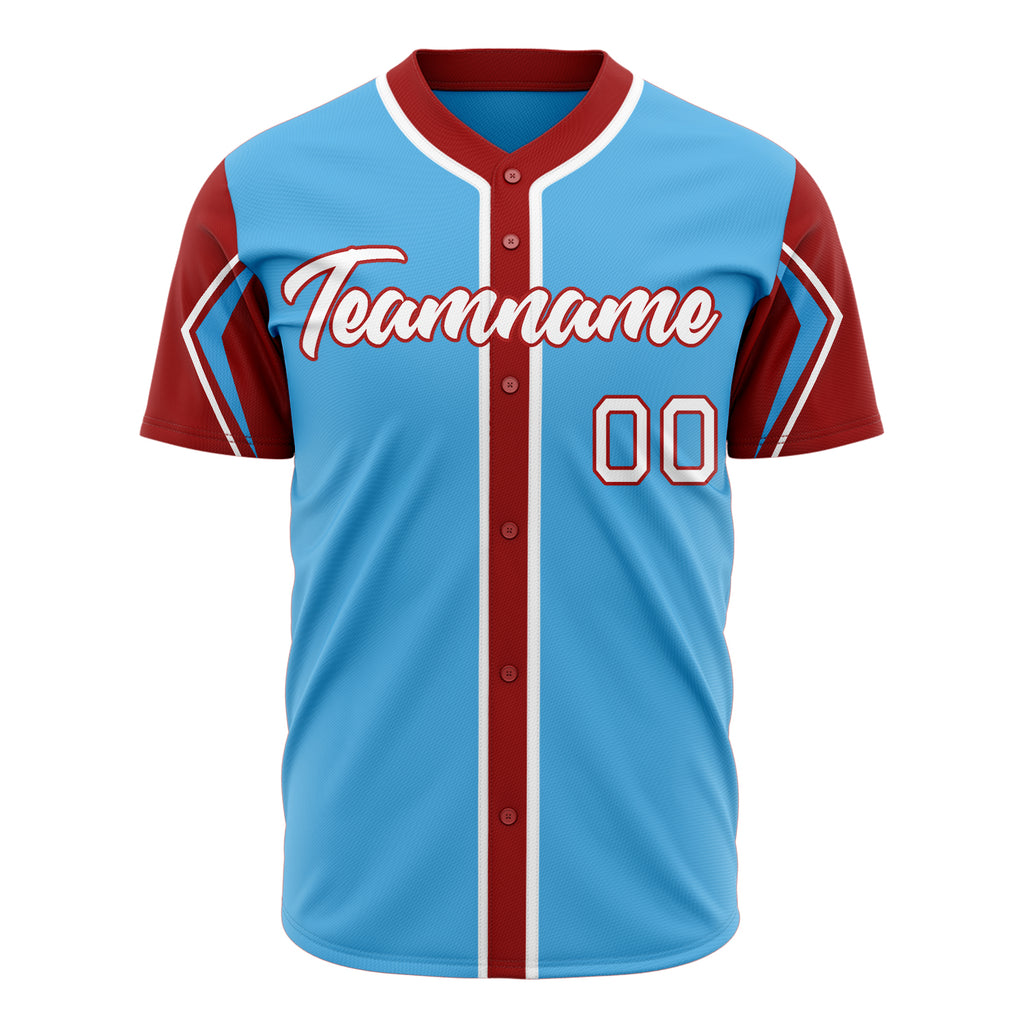 Custom Sky Blue Baseball Jersey (With Red 3 Color Arm Shapes)