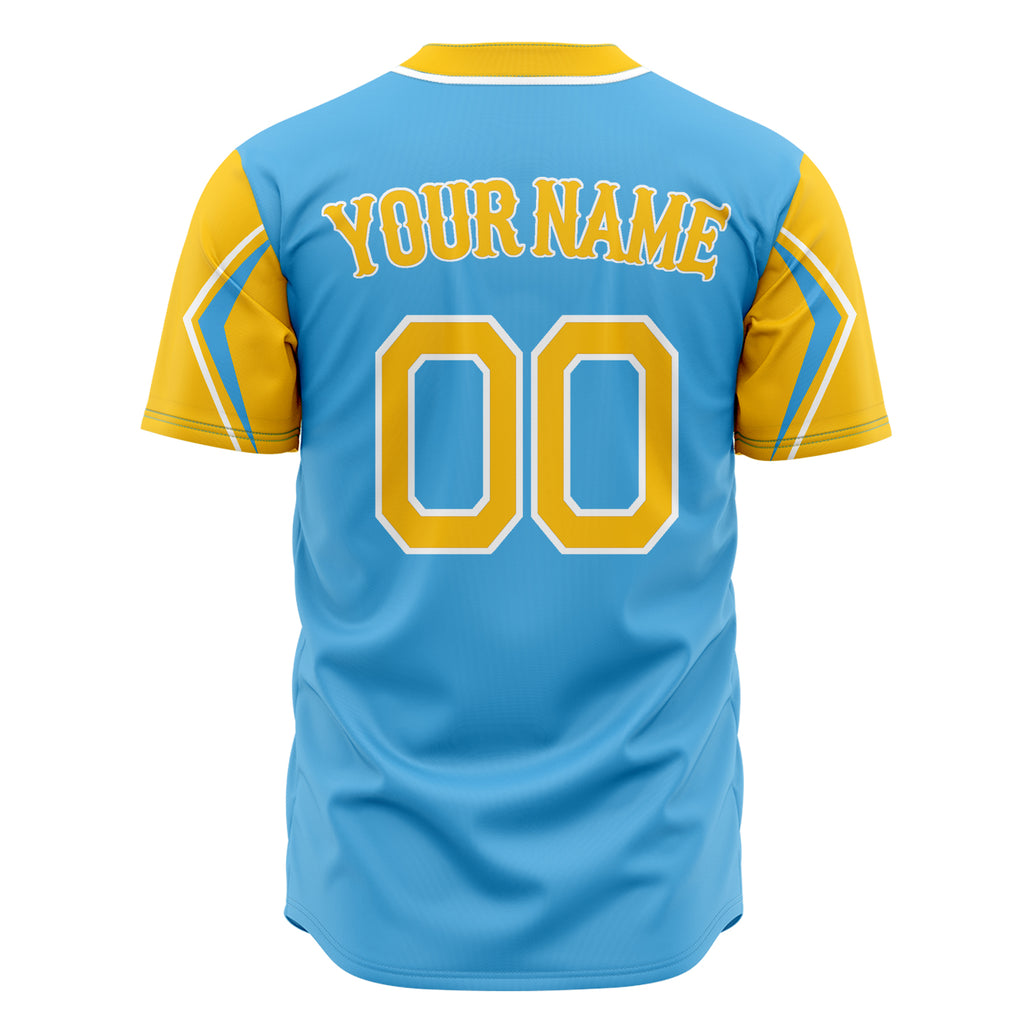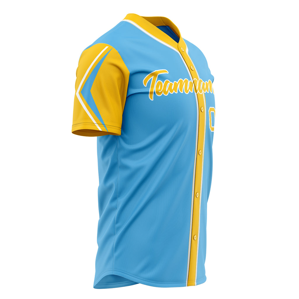 Custom Sky Blue Baseball Jersey (With Yellow 3 Color Arm Shapes)