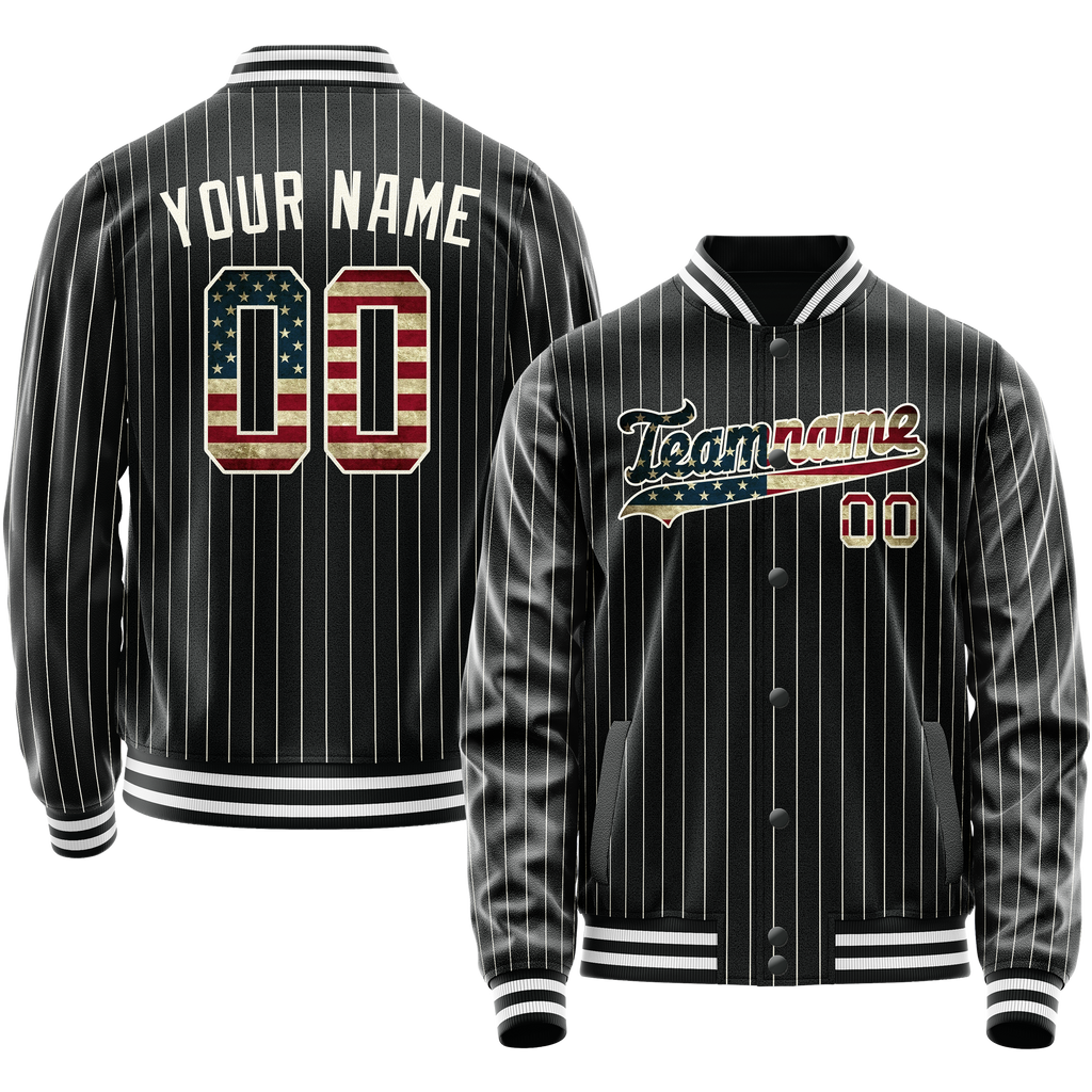 Custom Black Vintage-Usa-Flag Cream Pinstripe Varsity Letterman Jacket