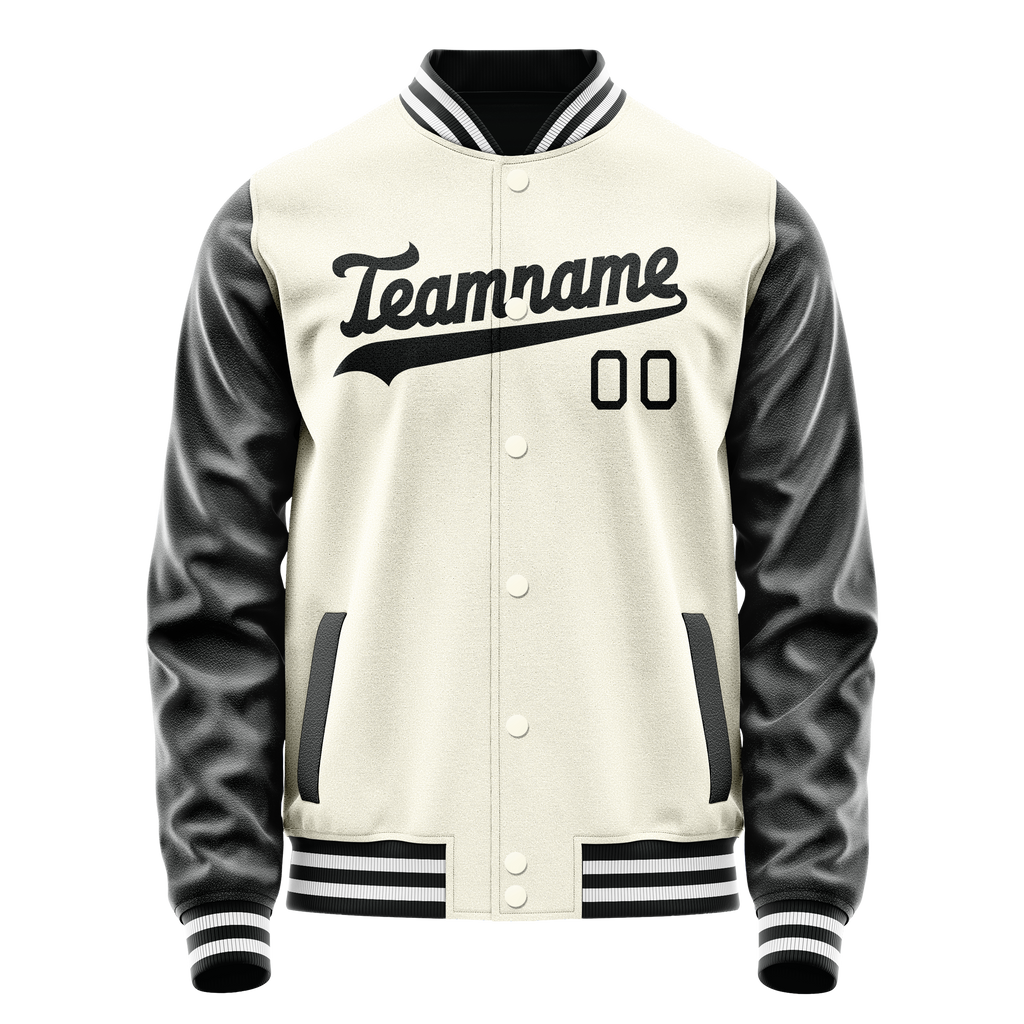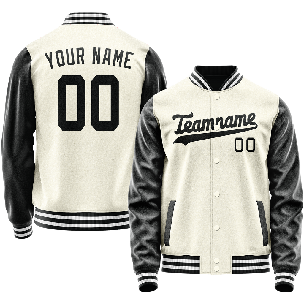 Custom Cream Black Solid Color Varsity Letterman Jacket
