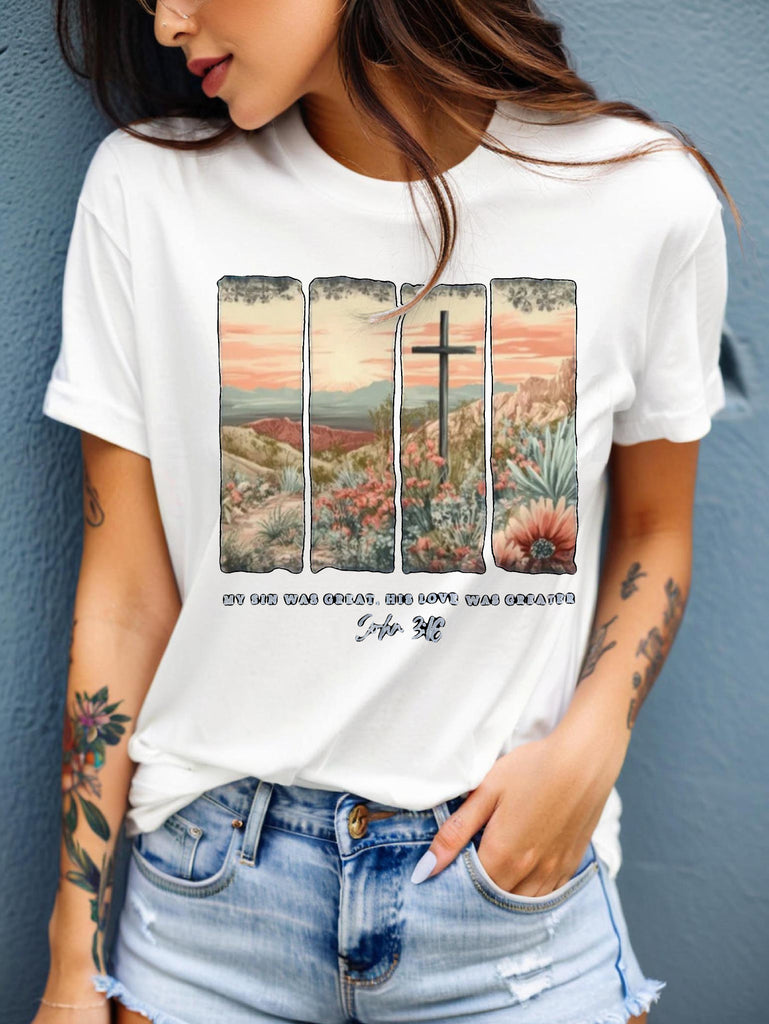 Graphic Shirts For Women Serene Desert Landscape With Sunset Cross And Cactus Flower, Womens White Tee, Country Shirts Womens