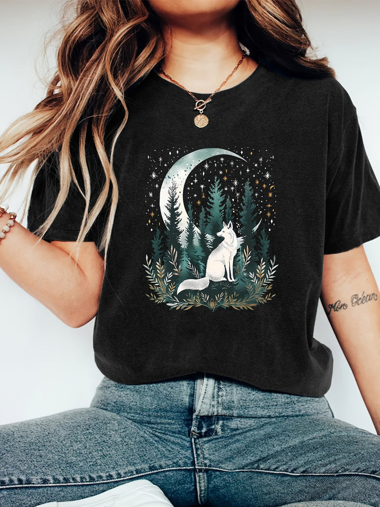 Green Shirt Womens White Fox Sitting Under Moonlight Among Tall Forest Trees And Sparkling Stars Tshirt, Womens T Shirts, White Cotton Shirt Women
