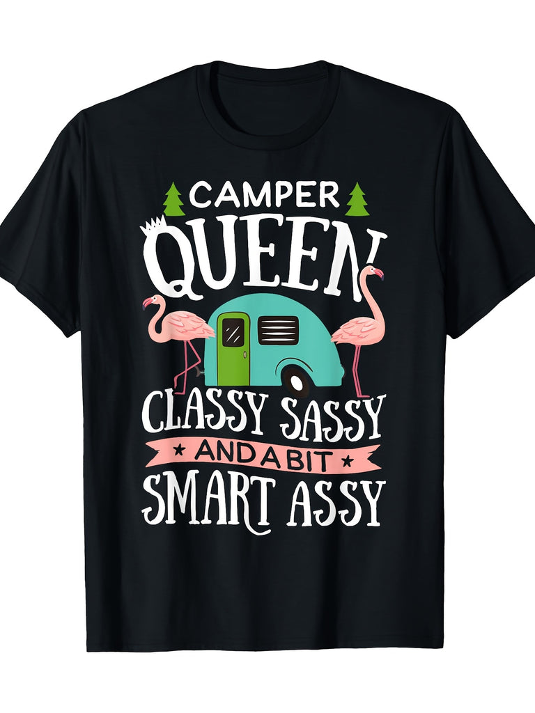 100 Cotton T Shirts For Women Camper Queen Classy Sassy And Bit Smart Assy With Pink Flamingo And Vintage Caravan Tshirt, Black T Shirt Women, Basic Tees Women
