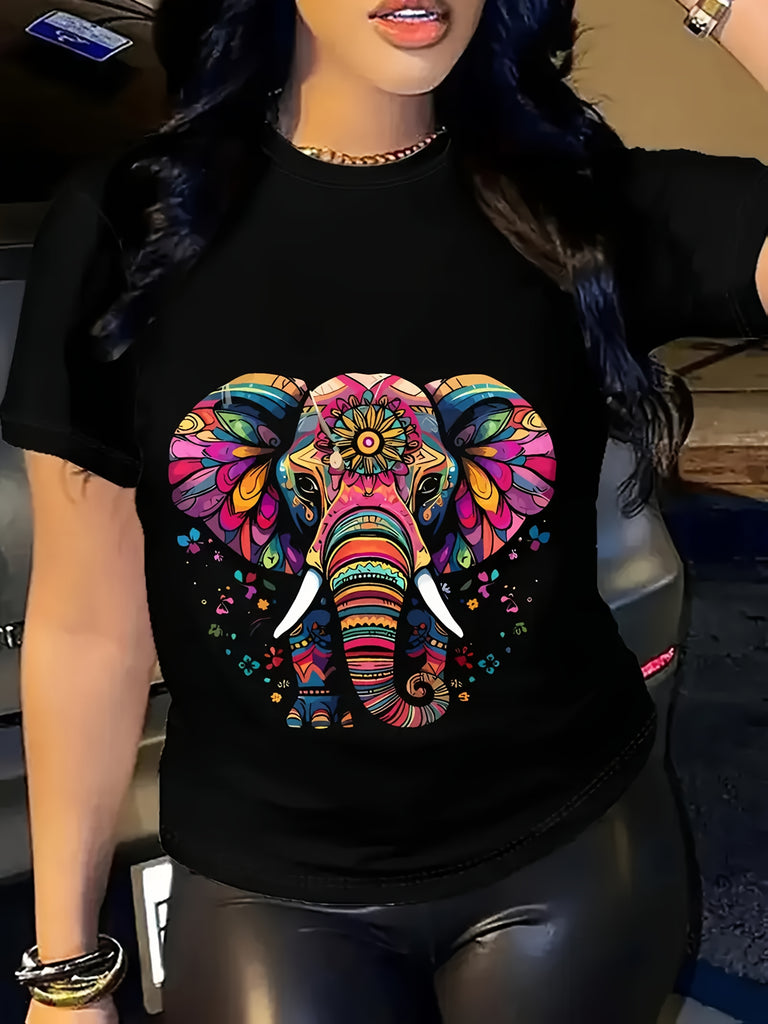 Basic Tees Women Colorful Floral Pattern With Intricate Details Surrounding Majestic Elephant, White Cotton Shirt Women, Cotton T Shirts For Women