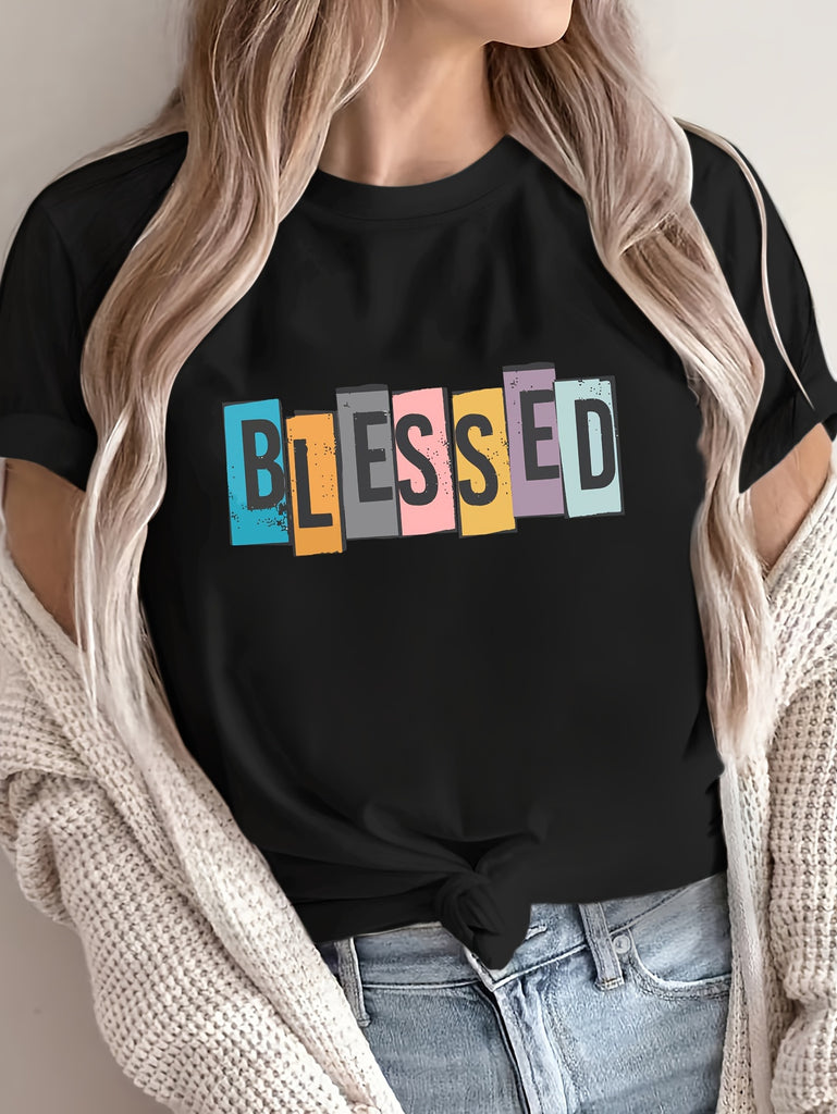 Black T Shirt Women Blessed Colorful Letters With Playful Design On Black Tshirt, Red T Shirt Women, Womens White Tee