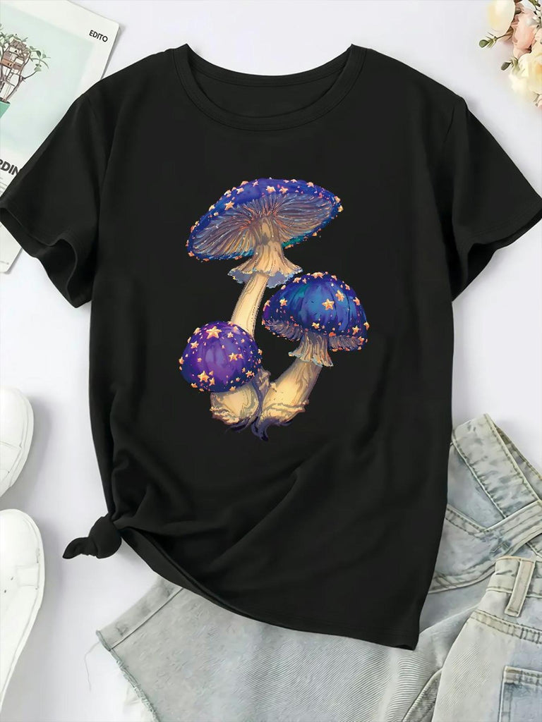 Cotton Shirts For Women Vibrant Purple Blue Glowing Mushrooms On Black Cotton T Shirt, Womens Night Shirts, Vintage Shirts Women