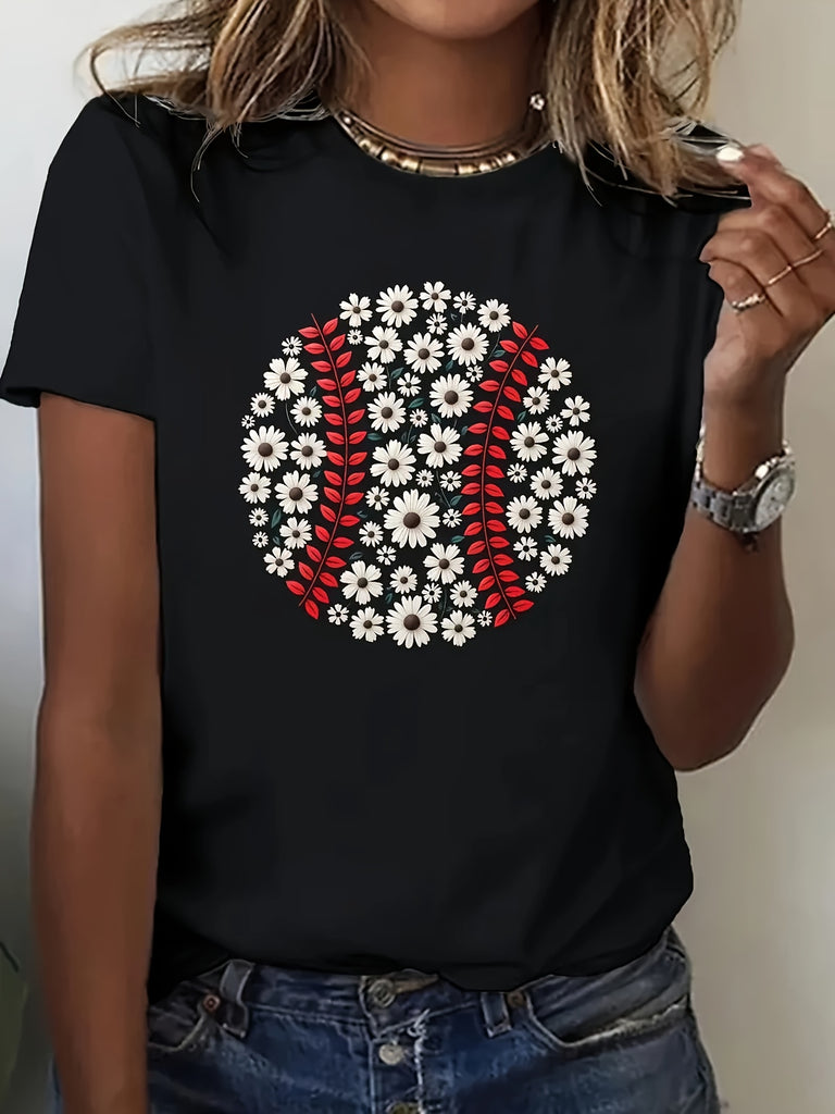 Country Shirts Womens Baseball Pattern With White And Red Daisy Flowers On Black Tshirt, Womens Tees, 100 Cotton T Shirts For Women