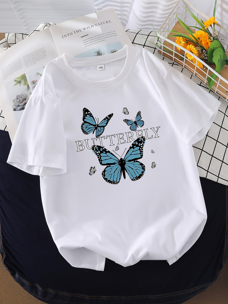 Cute Graphic Tees For Women Blue Butterflies With Delicate Wings Fluttering Over Printed Tshirt, Womens White Tee, Women Tshirts