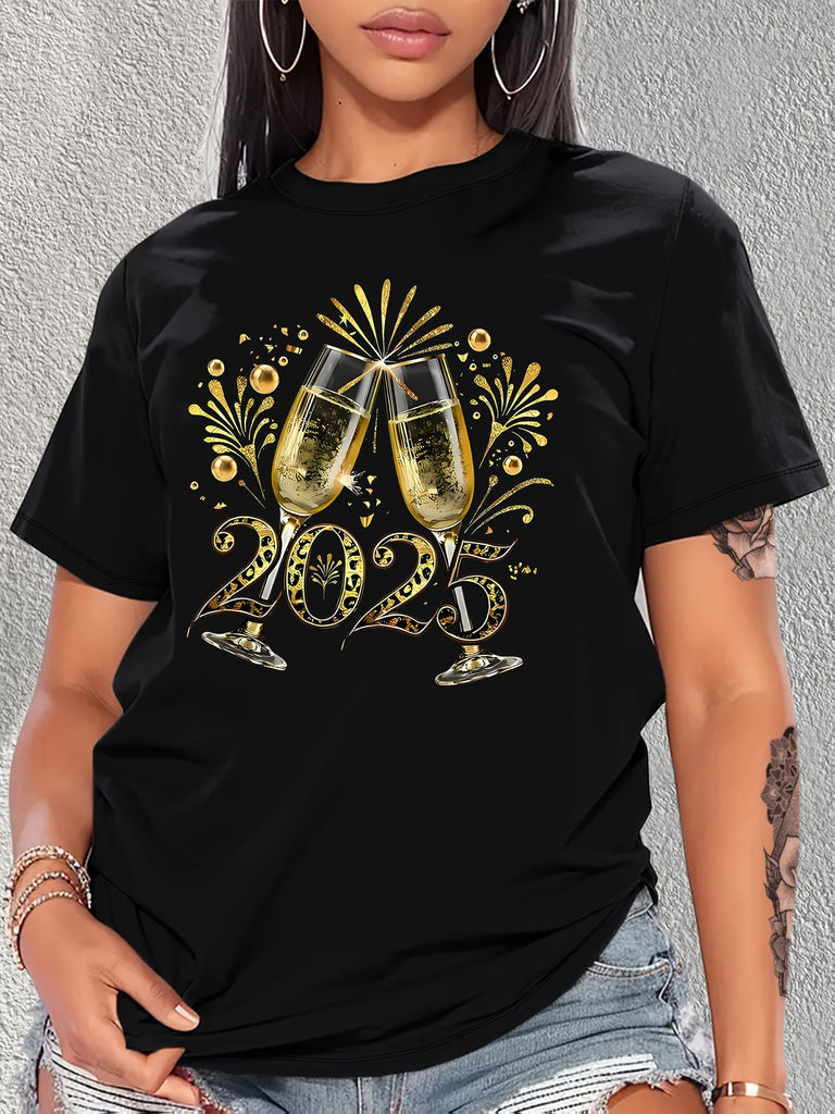 Cute T Shirts For Women Champagne Glasses Toasting With Sparkling Golden Celebration Numbers Twenty Twenty Five, 100 Cotton T Shirts For Women, Black T Shirt Women