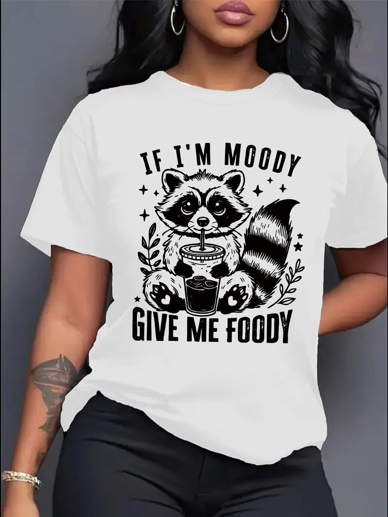 Funny Shirts For Women If Im Moody Give Me Foody Charming Playful Cartoon Raccoon With Delicious Food, 100 Cotton T Shirts For Women, Womens Shirts