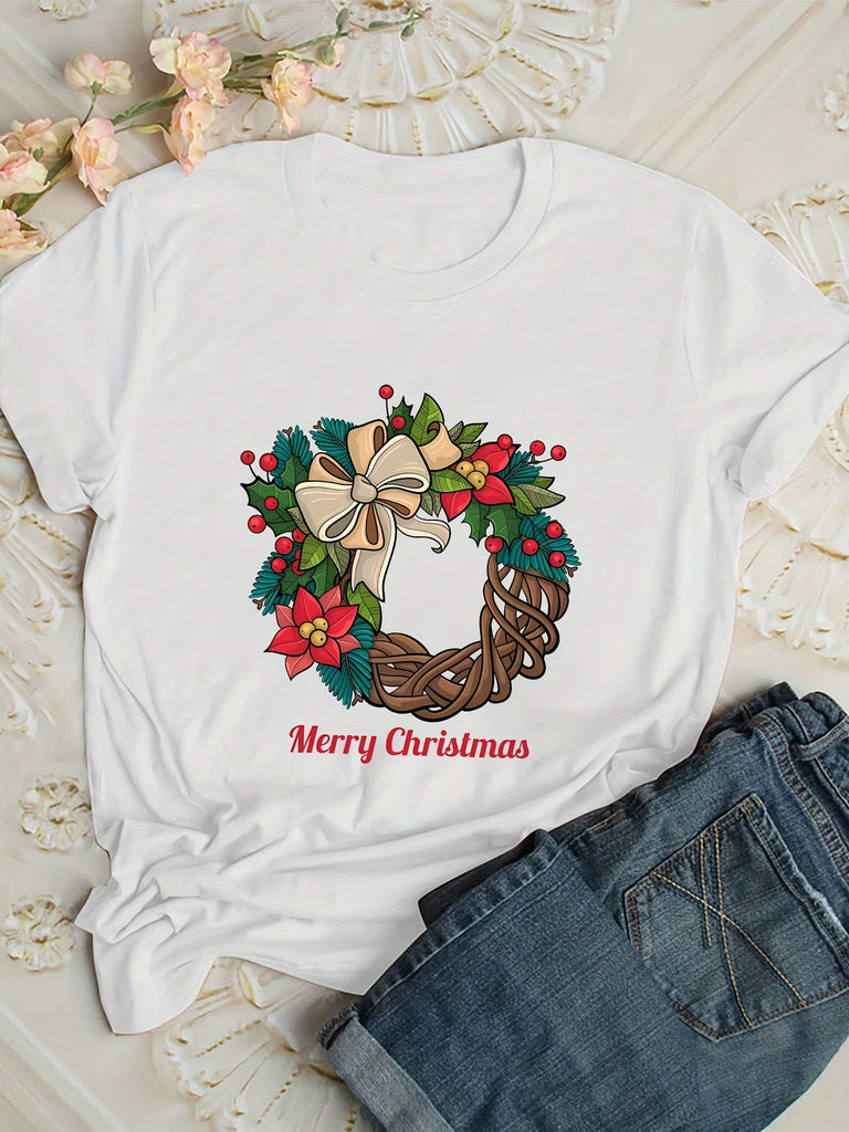 Funny Shirts For Women Merry Christmas Festive Green Red Blue And White Holiday Wreath, Women's Short Sleeve T Shirts, Cute T Shirts For Women