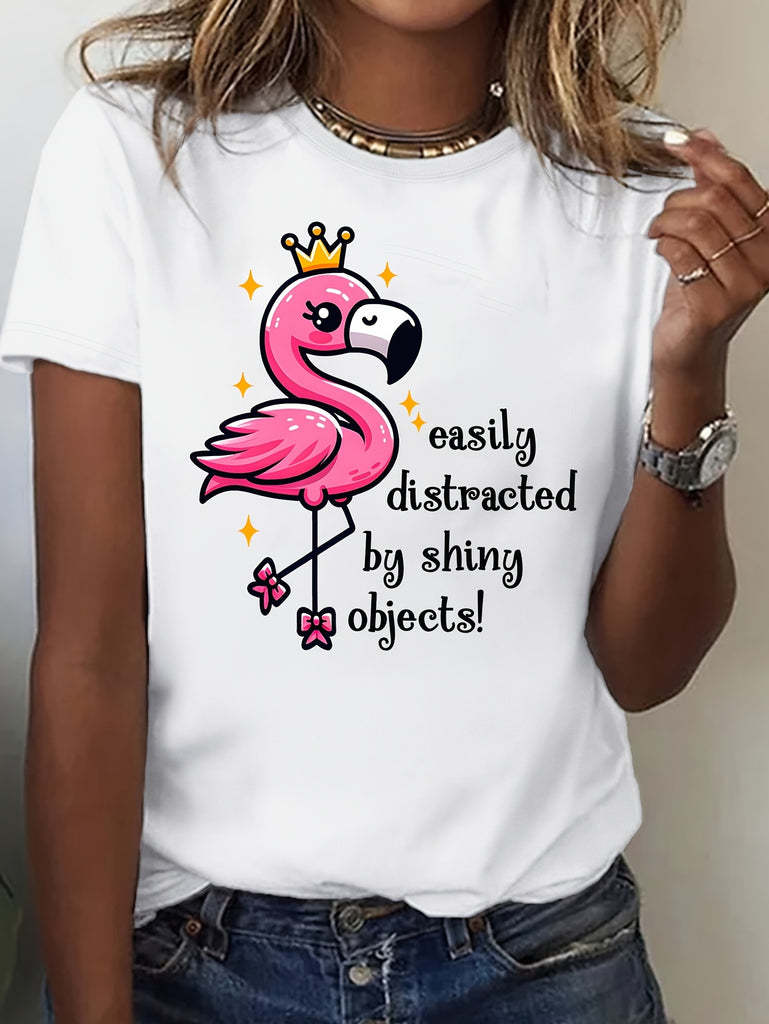 Funny T Shirts For Women Easily Distracted By Shiny Objects Cute Flamingo With Crown And Sparkles Shirt, Womens White Tee, Vintage Shirts Women