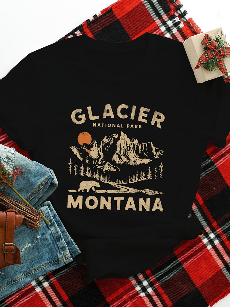 Funny T Shirts For Women Glacier National Park Scenic Mountain With Bear And Moon Tshirt, Womens Grinch Shirt, Green Shirt Womens