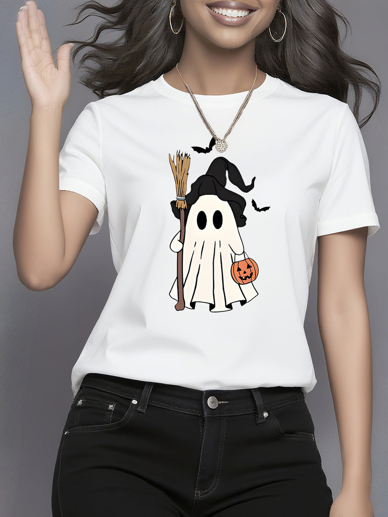 Funny T Shirts For Women Playful Halloween Ghost Holding Pumpkin And Broom T Shirt, Womens Graphic Tees Vintage, Graphic Tees Women