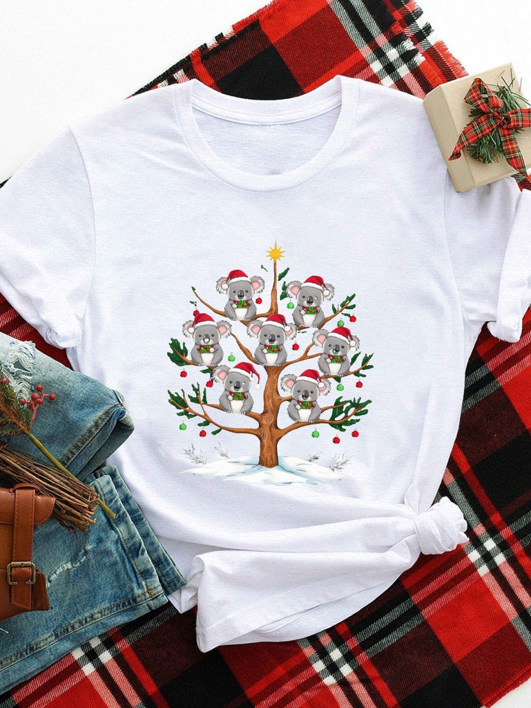 Graphic Shirts For Women Festive Winter Cartoon Koalas Wearing Hats And Scarves On Christmas Tree, Womens Graphic Tees Vintage, Womens Shirts
