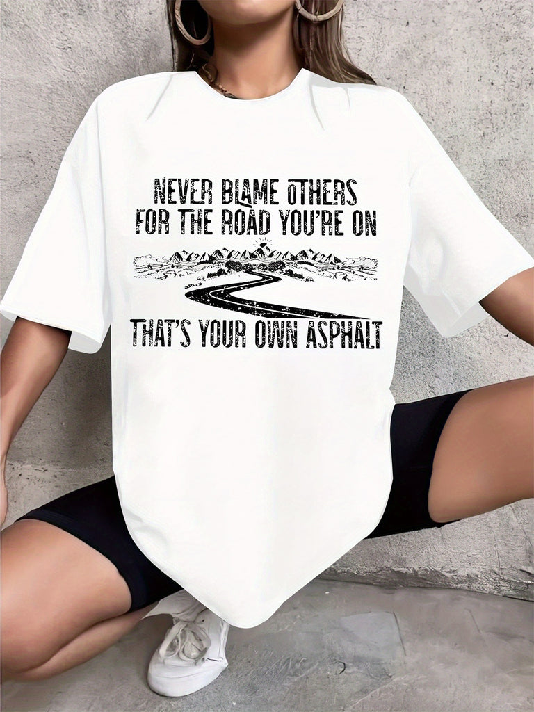 Graphic Shirts For Women Never Blame Others For The Road Youre On Thats Your Own Asphalt Urban Graphic With Paved Road Print Tshirt, Womens Graphic Tees Vintage, Graphic Tshirts Women