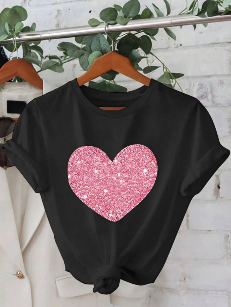 Graphic Shirts For Women Sparkling Pink Glitter Heart Shape On Classic Black T Shirt, Womens Graphic T Shirts, Cute T Shirts For Women