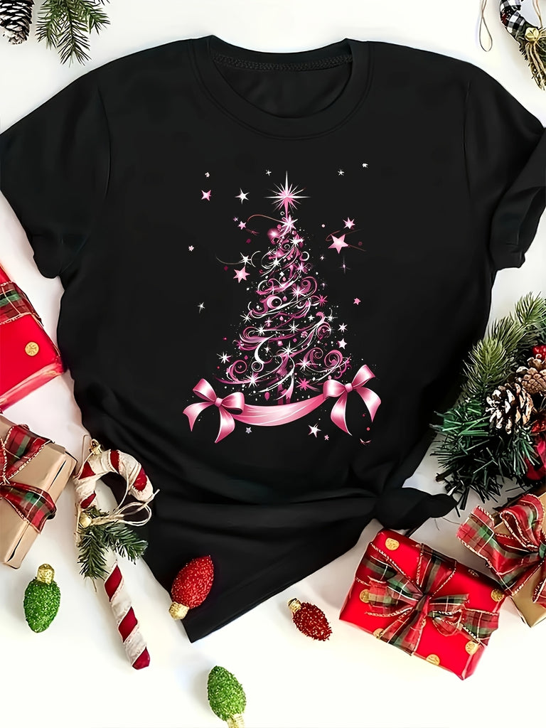 Graphic Tees Women Sparkling Pink Glittering Christmas Tree With Shining Stars And Ribbon Tree, Cotton Shirts For Women, Women Tshirts
