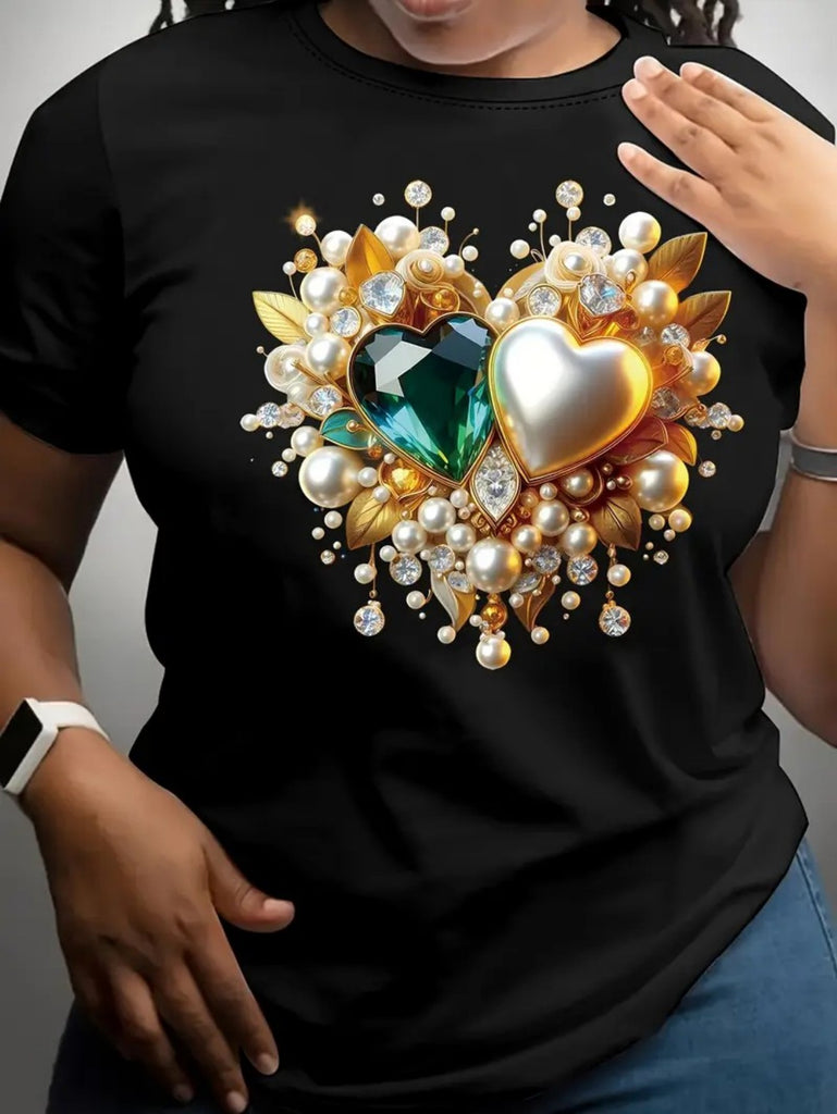 Green Shirt Womens Shiny Golden Pearls Surrounding Green Gemstone And Heart, Womens T Shirts, Cotton T Shirts For Women