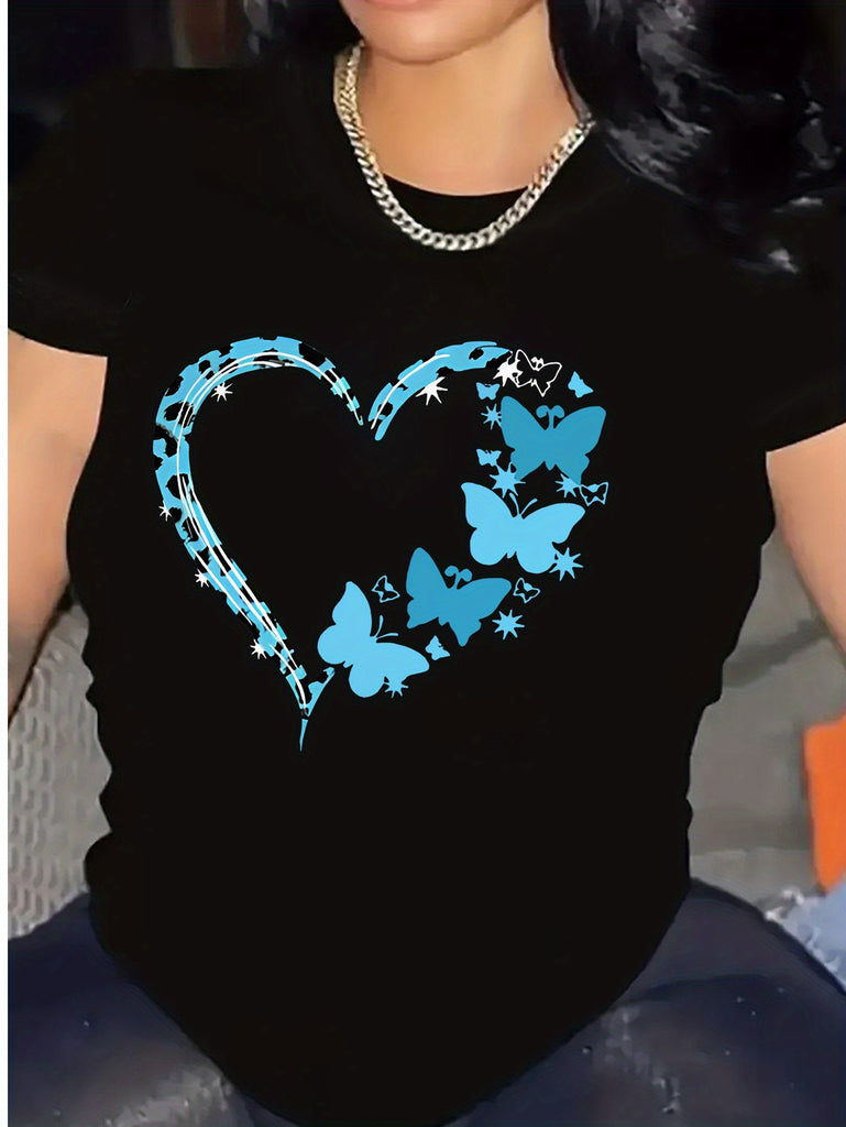 Grey T Shirt Womens Blue Butterfly Swarm Surrounding Heart Shape With Soft Texture Tshirt, Vintage T Shirts Women, Cute T Shirts For Women