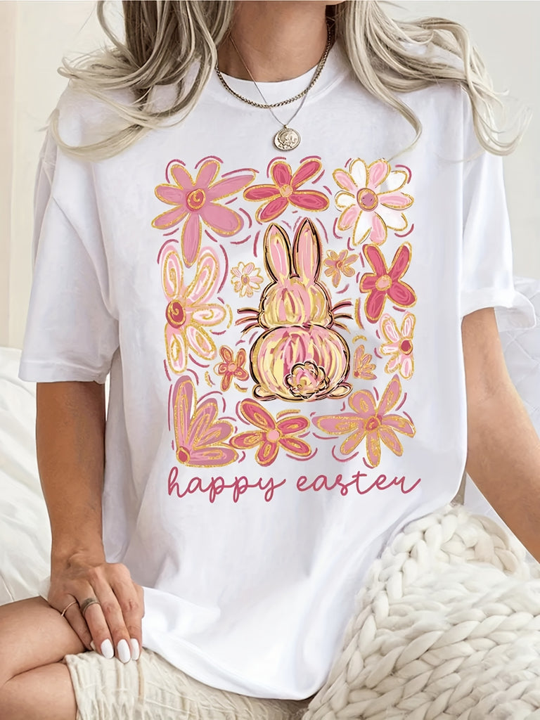 Grey T Shirt Womens Happy Easter Cute Bunny Among Bright Colorful Flowers Tshirt, Womens Grinch Shirt, Cotton T Shirts For Women