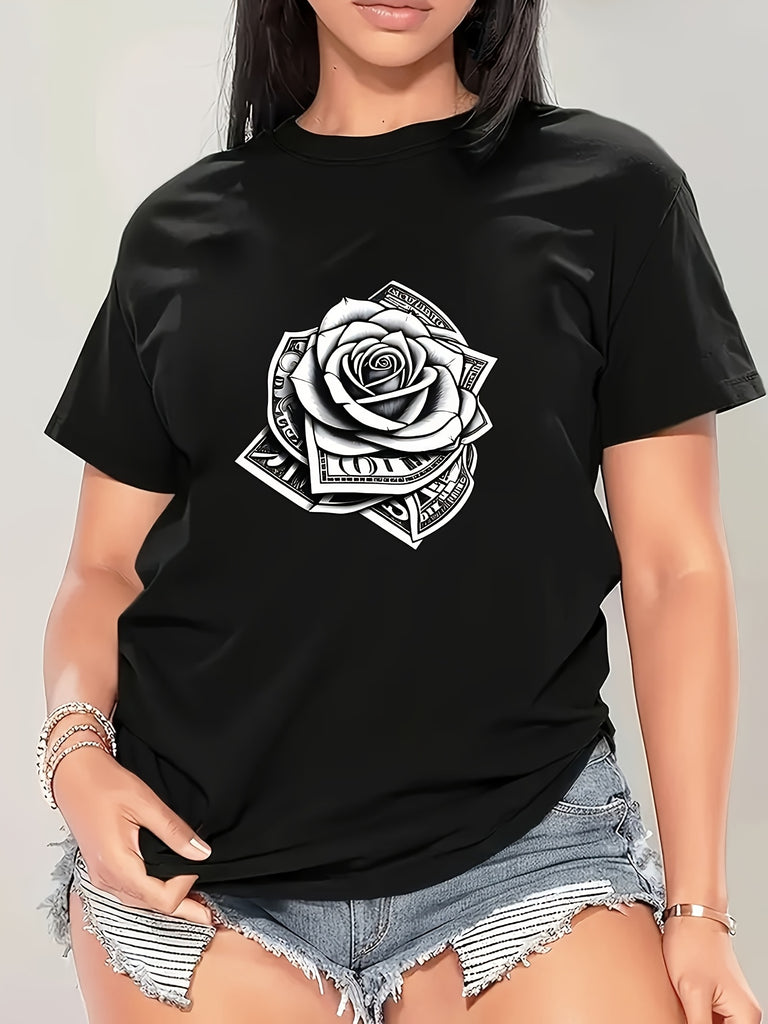 Vintage T Shirts Women Intricate Black And White Rose With Detailed Lines Flower, Women Tshirts, Cotton Shirts For Women