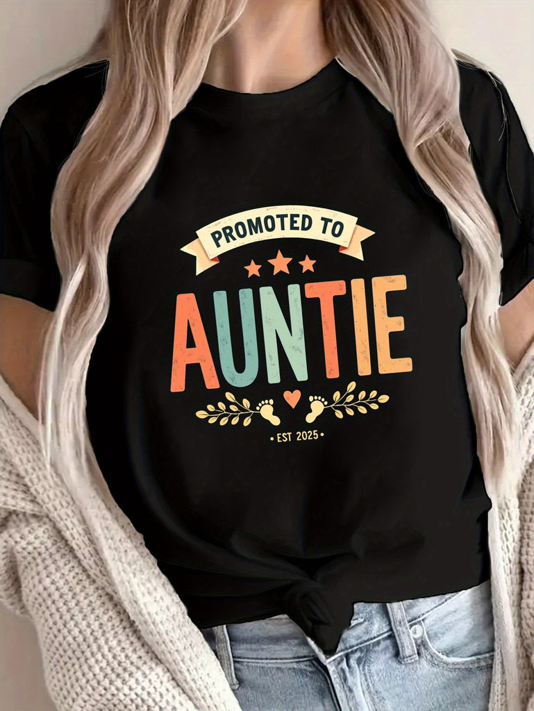 Women Tshirts Promoted To Colorful Text With Decorative Leaves And Stars Auntie, Red T Shirt Women, Womens Graphic Tshirts